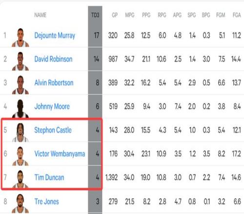 2.卡斯尔第4次三双队史第五多,已经跟文班亚马、邓肯一样多,(邓肯19年生涯);
