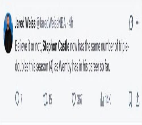 马刺记者杰登-韦斯写道:你们别不信,卡斯尔本赛季第四次三双已经跟文班亚马职业生涯一样多了。