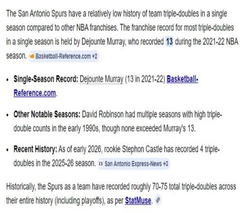 3.卡斯尔单赛季4次三双是联马刺队史第二多,第一多是德章泰-穆雷13次;