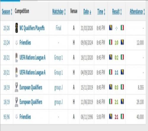 意大利在队史首次友谊赛交手中客场1-2输给波黑,此后意大利取得了4胜1平的不败战绩。