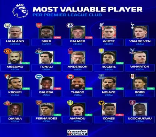 体育播报4月4日宣 德转盘点了英超20支球队每队身价最高球员,其中哈兰德、萨卡等在列,具体如下:
